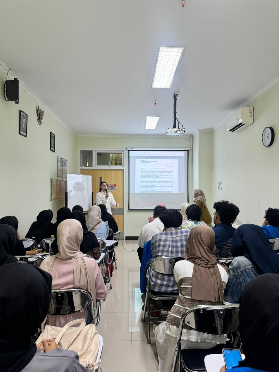 Suasana kelas berlangsung interaktif dan menyenangkan. Mahasiswa diajak berdiskusi, menganalisis contoh motivation letter, dan melakukan mini editing practice untuk memperbaiki grammar, punctuation, dan coherence.