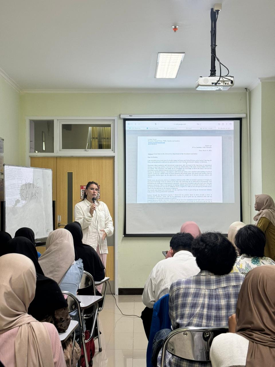 Pada pertemuan ini, mahasiswa belajar menyusun Motivation Letter for Applying as a Volunteer, mulai dari cara memperkenalkan diri dengan jelas, menuliskan pengalaman relevan, hingga menyampaikan motivasi yang meyakinkan. Loriane juga memberikan tips penting seperti penggunaan bahasa formal, struktur paragraf yang efektif, serta pemilihan vocabulary yang lebih profesional.