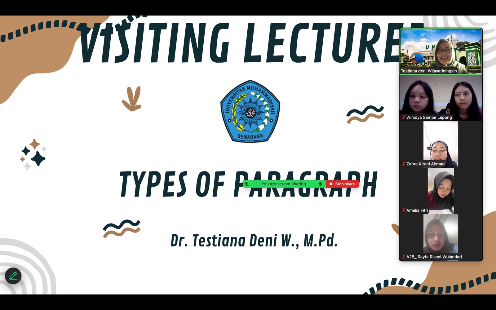Program Studi Pendidikan Bahasa Inggris, Fakultas Ilmu Pendidikan dan Humaniora (FIPH) Universitas Muhammadiyah Semarang (UNIMUS) kembali menyelenggarakan kegiatan Visiting Lecture bertajuk “Beyond the Basics: Writing Effective Transition Sentences Between Paragraphs”. Kegiatan ini merupakan kolaborasi akademik antara UNIMUS FIPH PBI dan UNM FBS PBI yang dilaksanakan secara daring melalui Zoom Meeting pada tanggal 29 September, 13 Oktober, 20 Oktober, dan 10 November 2025 (WIB) serta 10 Oktober, 22 Oktober, 5 November, dan 12 November 2025 (WITA).